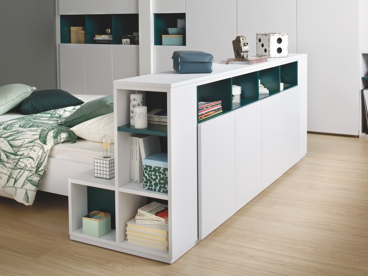For a cosy atmosphere beneath the eaves, a fitted wardrobe that divides the room in half is an excellent solution with storage columns and spacious compartments in varying heights and contrasting colours.